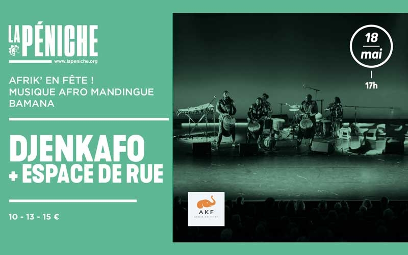Djenkafo vous embarque au son de la flûte peule et du N’Goni (guitare traditionnelle) sur des mélodies et des chansons rythmées par les percussions (balafons, batterie, calebasse, tama, djembé, sabar….). Leur présence scénique et leur énergie offrent au public un grand moment festif.